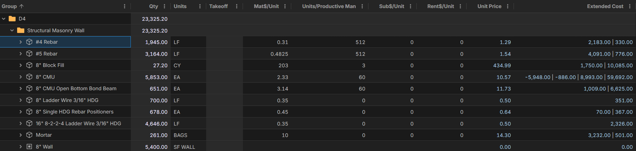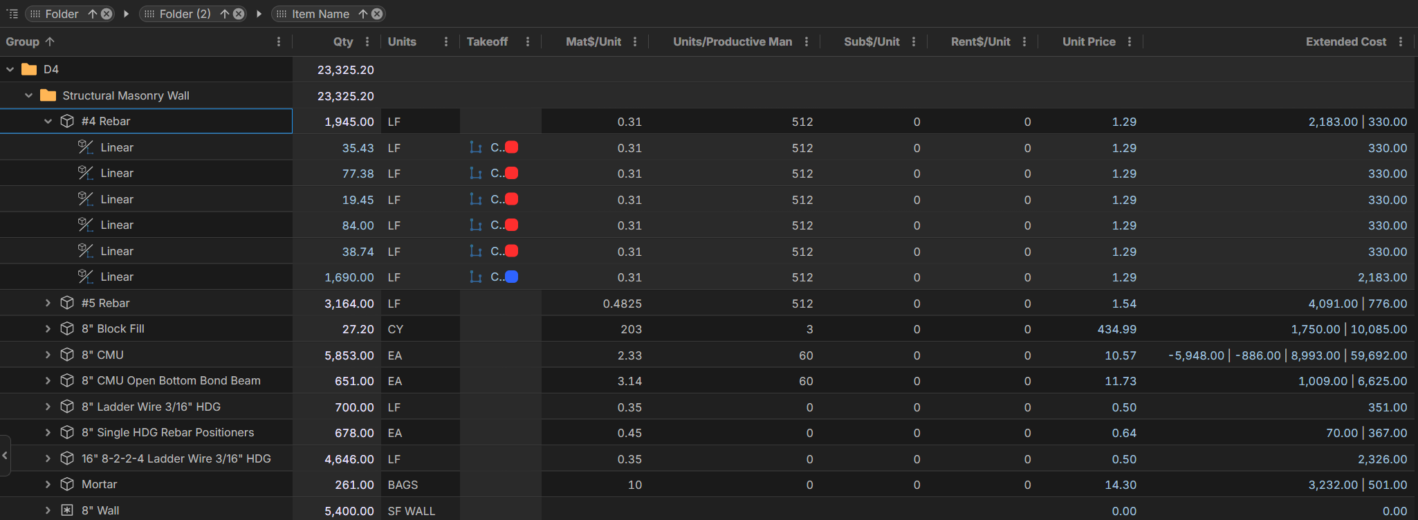 I'm working on building out a pricing structure more like the one we use in our current excel pricing sheet. I can't get the total custom properties to total as shown below in the extended cost column. Is this a bug or is there a way that I can make this column total instead of it being separated by the vertical lines. All #4 Rebar items shown below are identical. They are just on two different takeoff items. One is on a 13'4" tall interior wall and the other is on a 13'4" tall exterior wall.