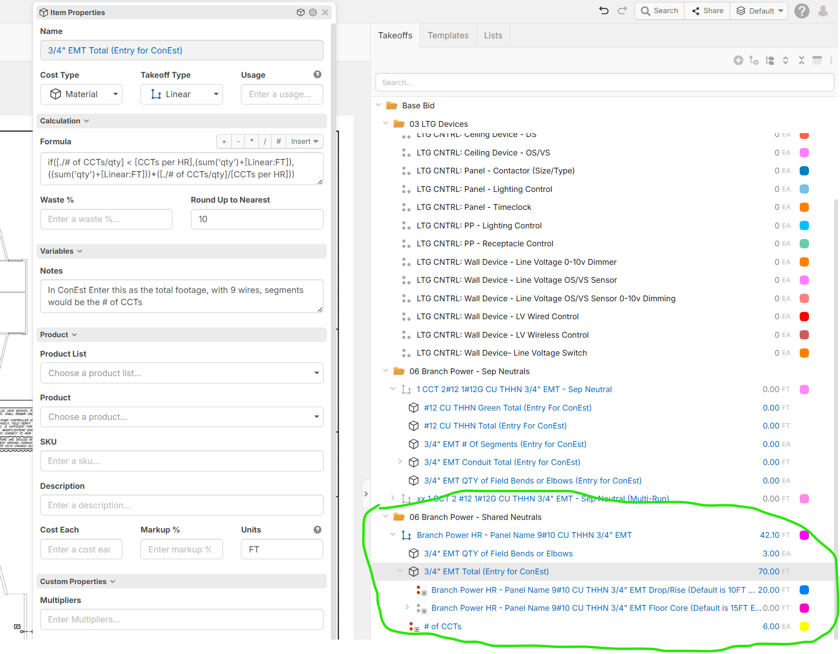 ceil(((([.# of CCTs/qty] / [CCTs / HR]) * (sum('qty') + [Linear:FT]))) / 10) * 10