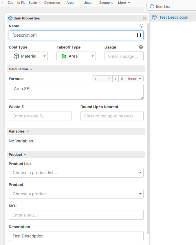 When creating items in an item list, using a formula with [Description] as the Name will simply display "[Description]" as the name of the item in the item list, but will display correctly once it's inserted in a Takeoff.