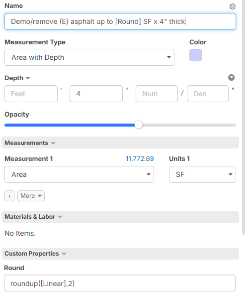 Any update on this? I really like the formula mode for naming takeoffs/items, however the number of decimals it rounds to is too much - at least to keep in the name.