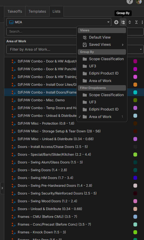 Hey Kyle, I just tested on my end & I was able to group in the lists. I think the only group by options that are different between templates & list templates are that there is no group by "Folder" and no group by "Takeoff Type". Are you missing any group by options other than those 2?