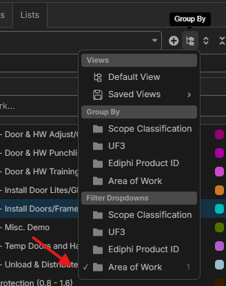 As a side note, in lists, we have the "Filter Dropdowns", which, it looks like, you have checked in your screenshot. Did you mean to group by "Area of Work" instead of showing the filter for "Area of Work"?