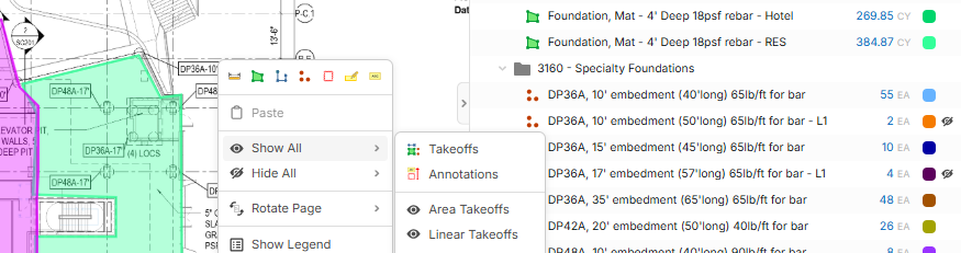 When I hit show all takeoffs, it does not show everything. Items that have been manually hidden on the right side, do not-unhide.