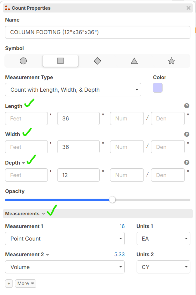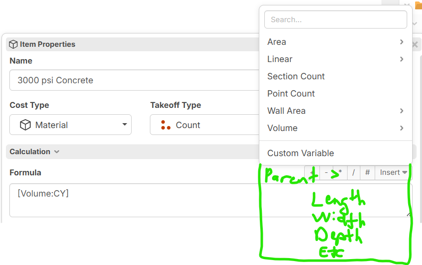 I know a lot of these parent values such as Length, Width, Depth, and measurements are available to use in the child formulas but I'm not sure what all is available. Could any available values be listed in the "Insert" drop down? Maybe add "Parent >" below "Volume >" and list anything else that we can use in the child formula? By the way, the way you have volume in CY, CF, and CI is awesome. That makes putting in a formula to calculate how many 2.25"x4"x8" brick it takes to build a 2'x2'x6' column so much simpler.