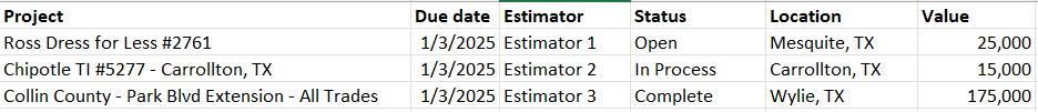Thanks for the input Nick. I know in your chat, you also mentioned that a summary by estimator would be nice too. For example: Estimator 1 has 5 open projects worth a combined total of $250,000
