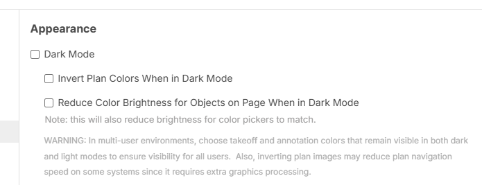 Hi Justin. We've experimented with some dark mode stuff, and even with some plan invert stuff, which looks pretty good. The biggest holdup I can think of currently is the colors for takeoffs or annotations. Since some users may be on dark mode and others may be on light mode within the same company. The colors of takeoffs may not seem correct or may have the wrong contrast for some users. For example: a note annotation with black text (and transparent background on the note) may look fine on a white set of plans, but if the plans were inverted for dark mode, then the black text may not be visible. We could maybe try some automatic color flipping there, too, but hard to say where to draw the line on what we flip colors for and which we leave. We'll keep trying to make it work.