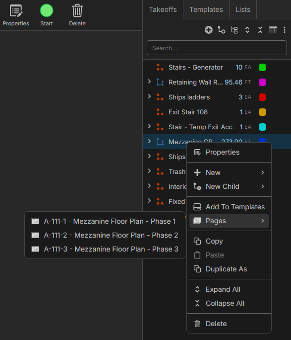4. I love the ability to select a takeoff and then jump to where that is in the project directly from the Takeoffs menu. I think a simple improvement would be to allow customizing the double click on these takeoff items so that it will take you directly to that item on the plan set (if it is located on multiple pages like the example below it would open up the picker so that you could choose). If customizing the double click isn't an option, maybe we could change the visible toggle to be the jump to page icon - we rarely hide markups. Final thought on this - if there is only one option it should jump directly when selected instead of offering a selection with only one option in it.