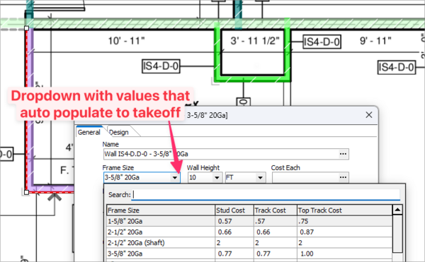 I have a setup where selecting an option from a dropdown automatically updates the costs for the bottom track, top track, and studs. I just change the dropdown, and all the costs update instantly.