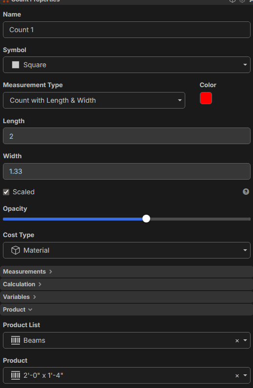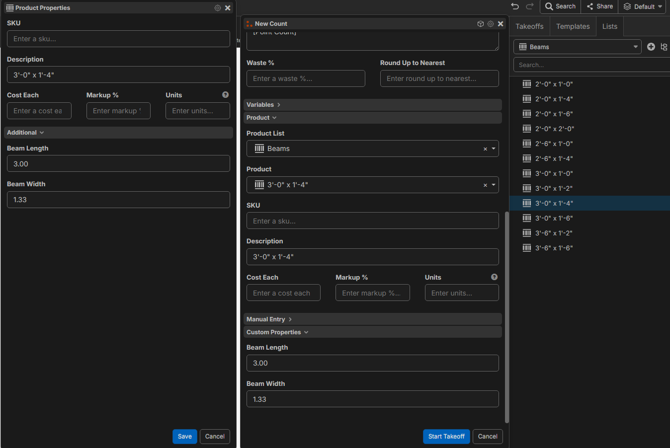 @Jes, you could set it up something like this. Granted, I had to do some back work to get to this, I took your list and asked CoPilot to change the formatting and split each into separate columns. then I Created a list called beams and did a batch import. I also had to create the "beam Length & Beam Width" to be able to import it. The custom properties on the count are inheriting the numbers based on the product selected. Like I said, rabbit hole. 🤣