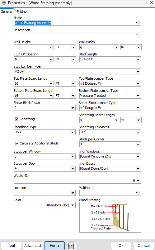 Probably the most complex example would be exterior load bearing walls for framing. Wall thickness, wall height, bottom plate type, hold down type & spacing, stud spacing, mid-height wall blocking, sheathing type & thickness, if using housewrap or not...For now, we plan to just set up templates without the input form but the form method is just a helpful way to build an estimate and not forget things. Even if it isn't as elaborate/customizable as Planswift but a way to do a drop down box of whatever categories that are useful to me, ie. bottom plates, top plates, sheathing, hold downs, etc. so it is all right there without having to search for, drag and drop item parts, this also helps reduce errors when working as a team or perhaps less experienced estimators, if we could share the same templates once they are created (now that I think of it, I'm not sure if sharing templates with the team is currently possible in zz). We do a lot of the same stuff over and over again with a small list of items for each variable but there is quite a few variables in an exterior wall.
