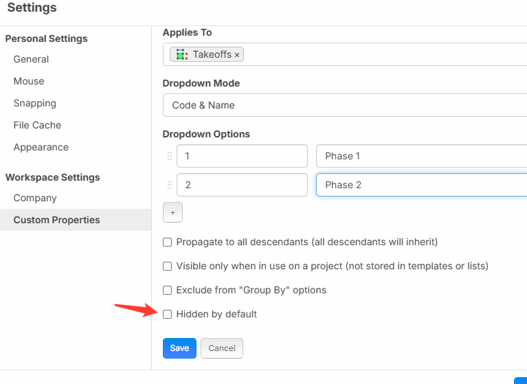 Thanks for all the posts here. It's great. We are working on a checkbox to allow custom properties to be "Hidden by default". Then you can show them as needed on specific templates or takeoffs. That should help a lot. There would still be a central list of Custom Properties which will allow you to set them up and re-use them whenever you want. (Side note: you can see some extra checkboxes as well for "Exclude from Group By options, and propagate/inherit stuff that is still in progress).