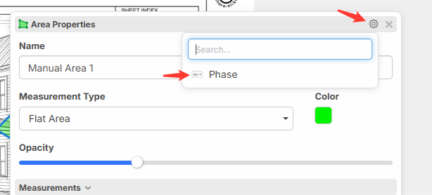 We're still working on how the user will show them on a specific takeoff, but for now we have so you hit a gear here, and then just click "Phase" in this example, and the property becomes available on the currently open takeoff or template. That way it's out of your way until you need it. Eventually, as a time saver, you'll be able to build a property on the fly from here without going to Custom Properties (but would still be saved in Custom Properties for central management).