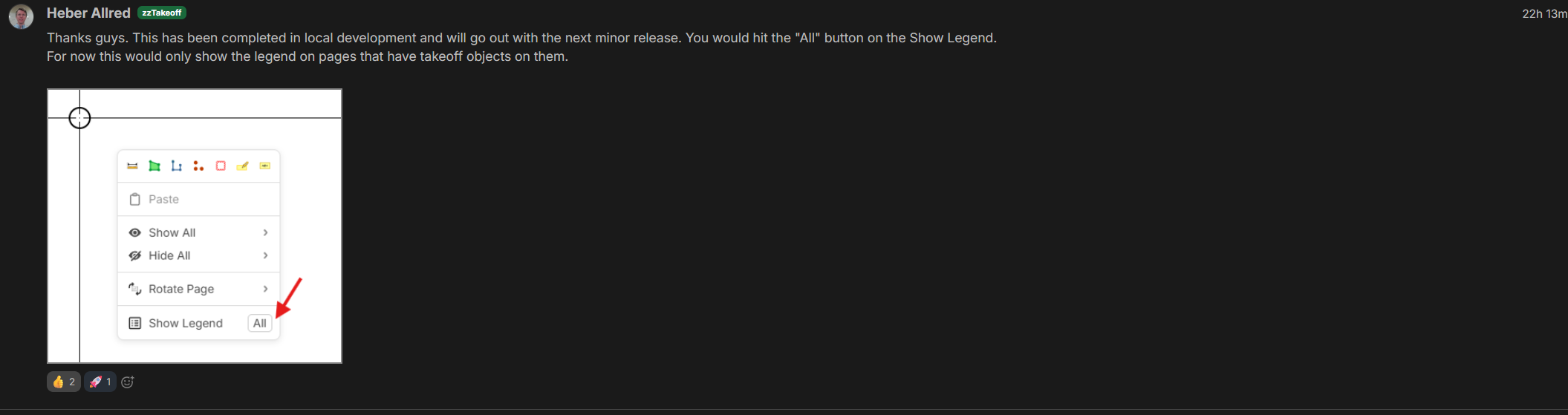 When adding a legend, it would be helpful to have an option to apply it to all sheets with takeoffs.” :)