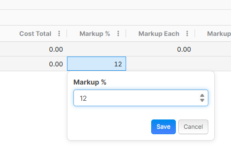 You currently can't update the markup % for the takeoff row, but what you can do in the meantime is create a custom property at the folder level or at the takeoff level, inherit it down to the items, and make markup % reference this custom property. The custom property that you create to be set at the folder or takeoff level will be editable in the grid.
