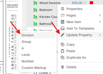 So if you go into "Settings" you can add custom properties. For example, if you add a "Division" custom property, you will now be able to set the "Applies To" for "Takeoffs" and this field will show up on all takeoffs. Then it also becomes available to group by.