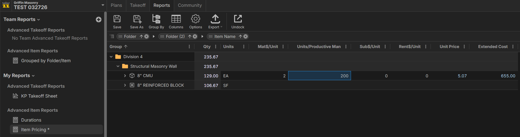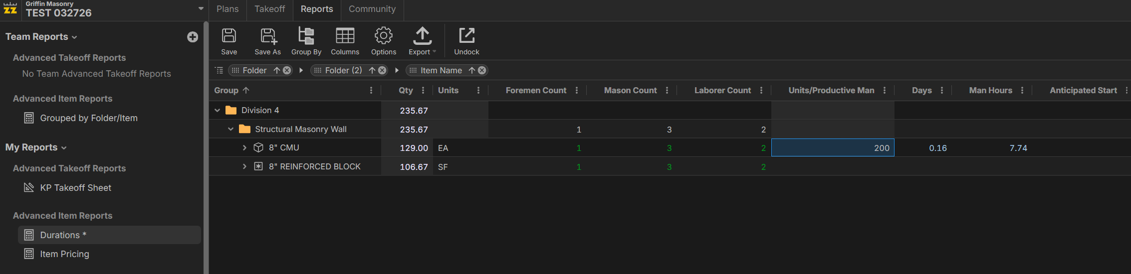 An example of a duration report driven off specific crew makeup and production rates:
