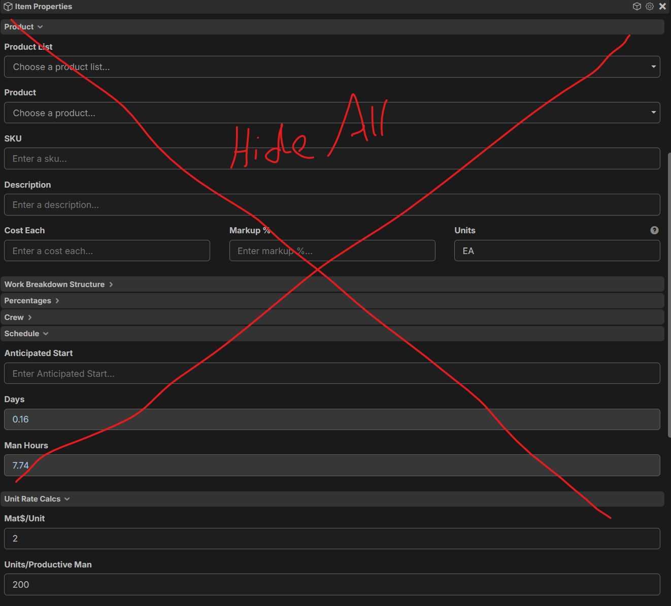 I like the idea of being able to hide hard coded fields if wanted. Our pricing structure will not work with hard coded fields, so all my pricing structure sits in custom properties. For us, it's not really a problem if its custom or not. Those production values will be set in the template and then modified from the reports. In reports, you can put it wherever you want it, regardless of if it's custom or hard coded.