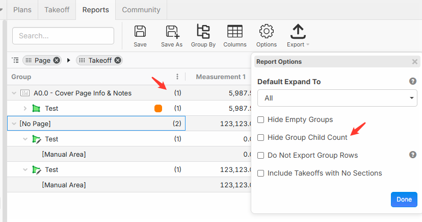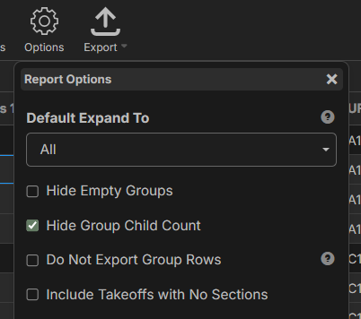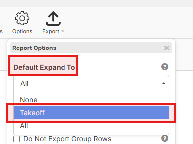 I believe for your use case, you want to set the "Default Expand To" to "Takeoff". The reason why is that when we do an export, we export based on the default visible rows, so if you only expand to the takeoff level by default, the sections won't be exported as well.