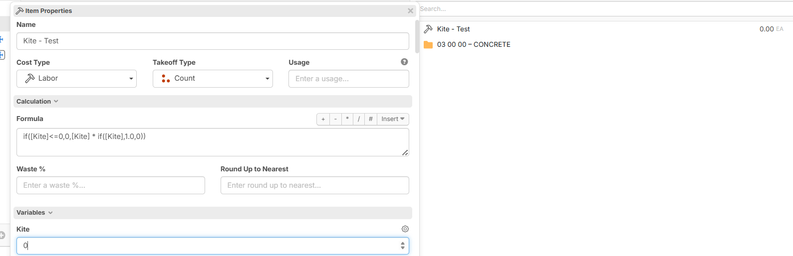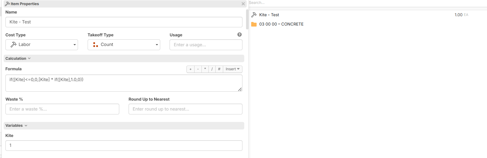At the moment, zzTakeoff does not reliably support checking whether a description contains specific text such as “kite” within a formula. I found that all my test formulas with " " are not working.