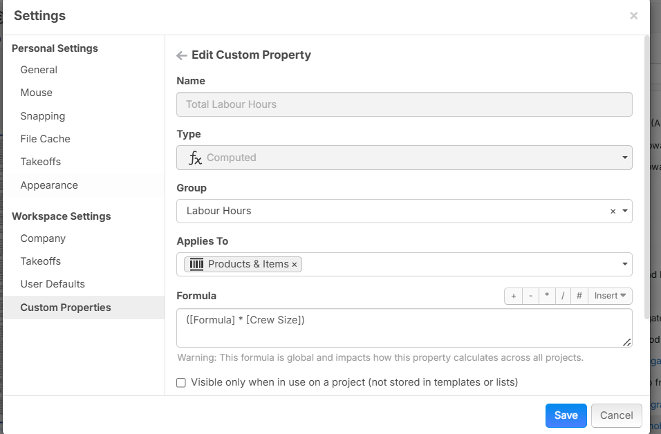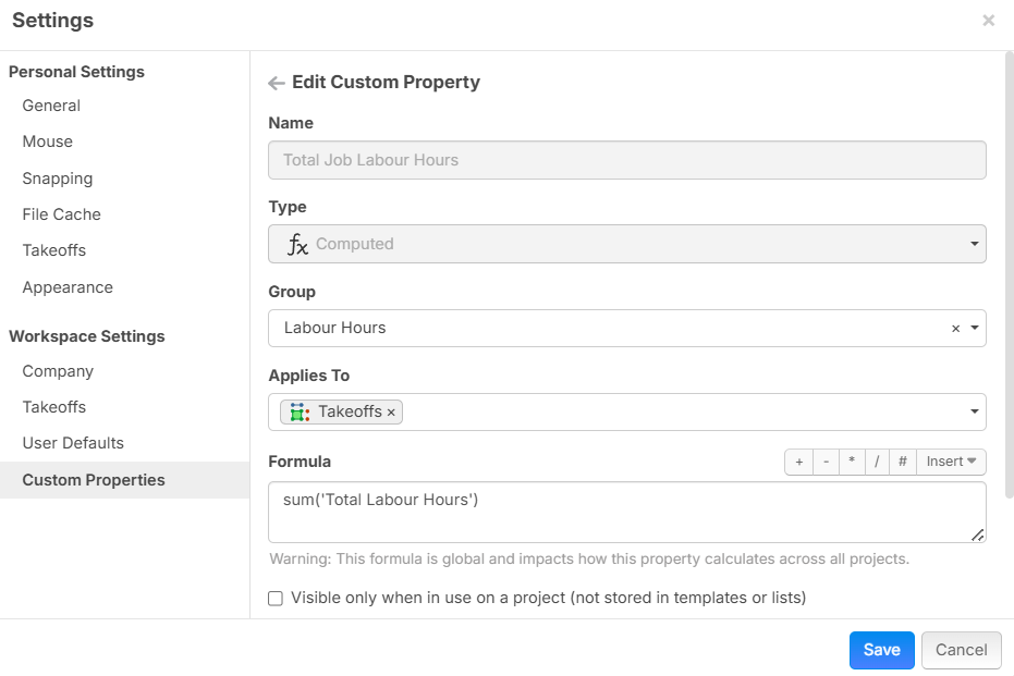 When I created the Custom Property for Total Labour Hours, I initially set it as a Computed formula: