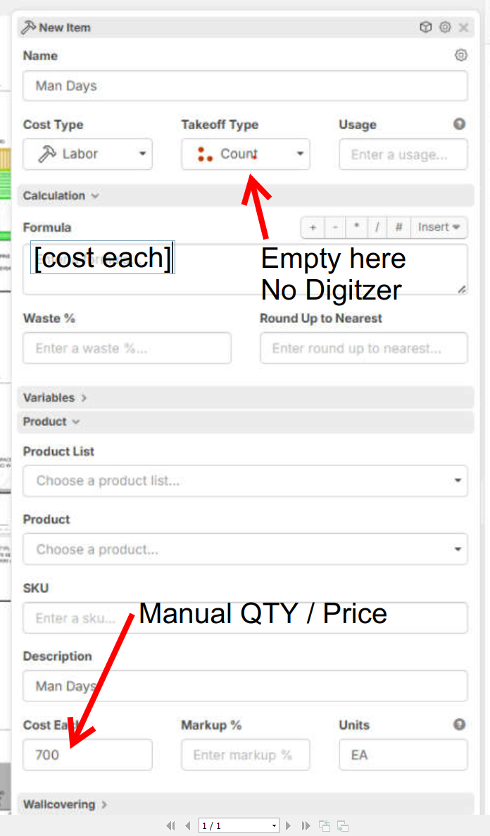 For example we usually throw a couple of man days into a job we are pricing. We do not want to have to nest it under a digitzer, but rather just manually input the value without it being a "takeoff" and have it show up on a report.