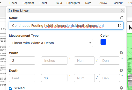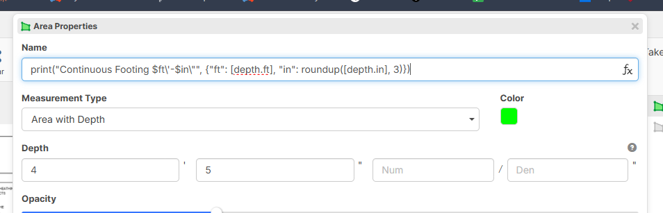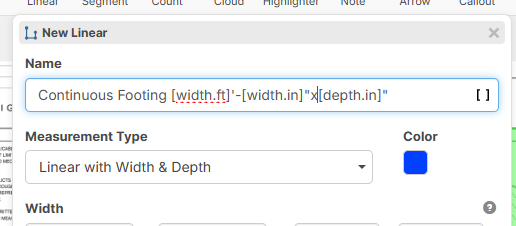 Is it possible to write a formula in the Name property for a linear takeoff which will include the [Width] in feet and inches plus the [Depth] in feet and inches. I would like the Name to automatically read Continuous Footing 2'0"x1'4"d as an example.
