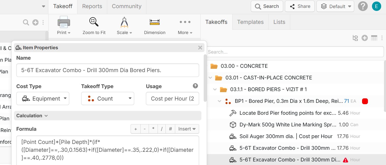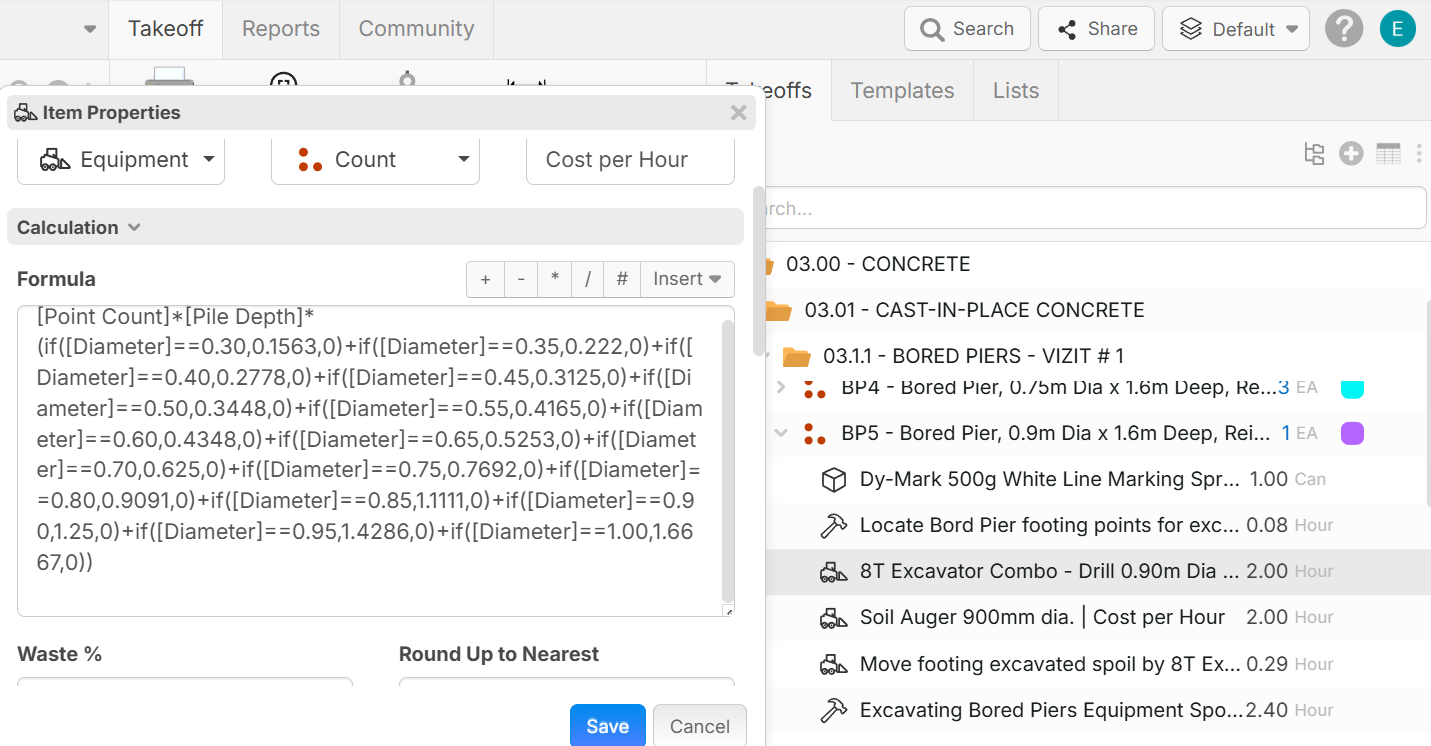 I am implementing the calculation for excavator drilling hours per linear meter using the 'IF' formula for bored piers. For this case, the pile depth is 1.6 m, the point count is 71, and the diameter is 0.30 m. The expected result should be 17.76 hours (1.6*71*0.1563), but the formula is given me 25.24 hours. I have no problems doing this 'if' formula in PlanSwift, but I encounter problems here, obviously I'm doing something wrong. I believe the formula it is skipping 0.1563 and is using 0.2222.