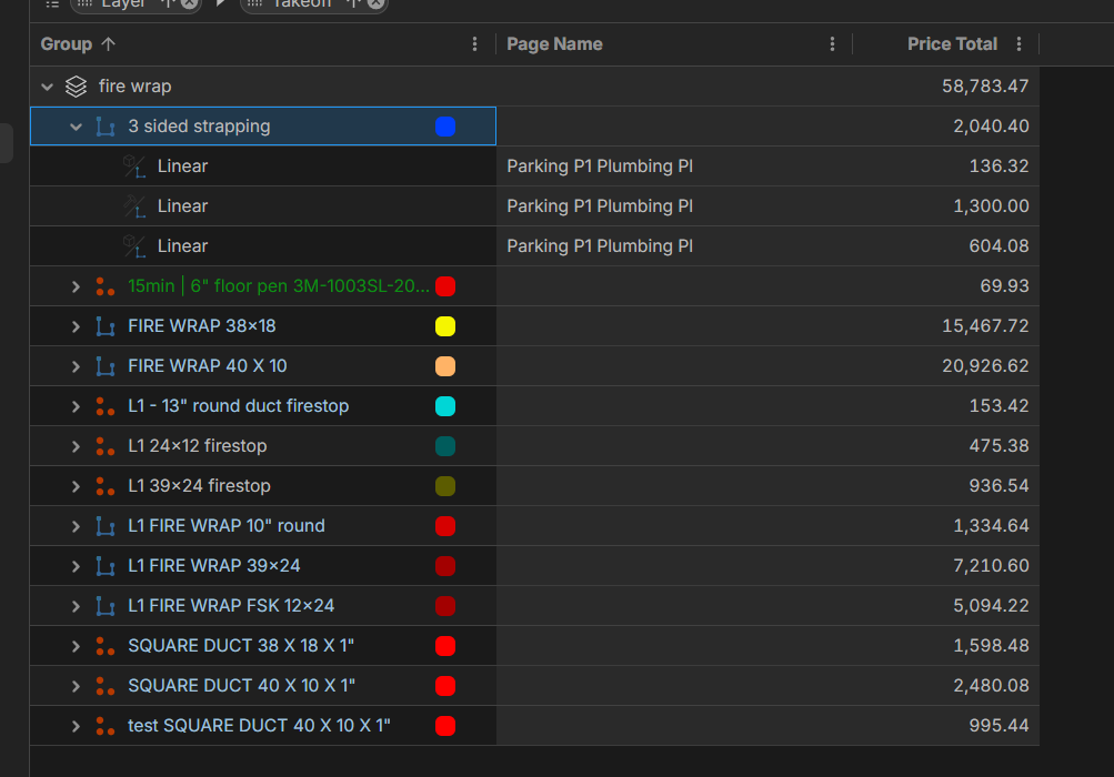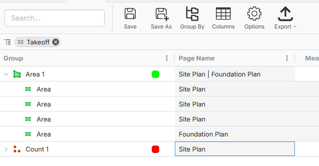 As a side note, if you group by page and then group by takeoff, we do show the page name on the takeoff level, as the takeoff is already scoped to a single page.