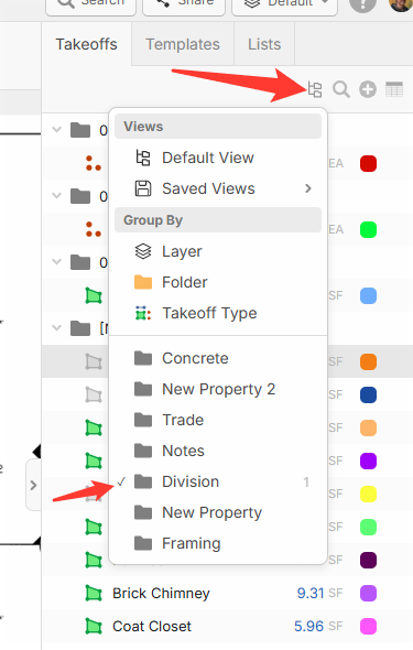 2. In the Takeoffs tab, click the little folders to choose the view and select the WBS that you want to group by (Division in my example)