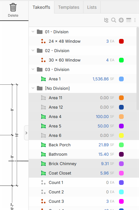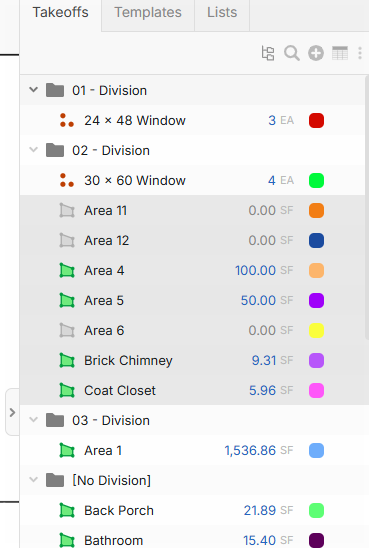 3. You can then select all of the takeoffs that you want to move into a division (use Shift+Click and/or Ctrl+Click to multi-select them)