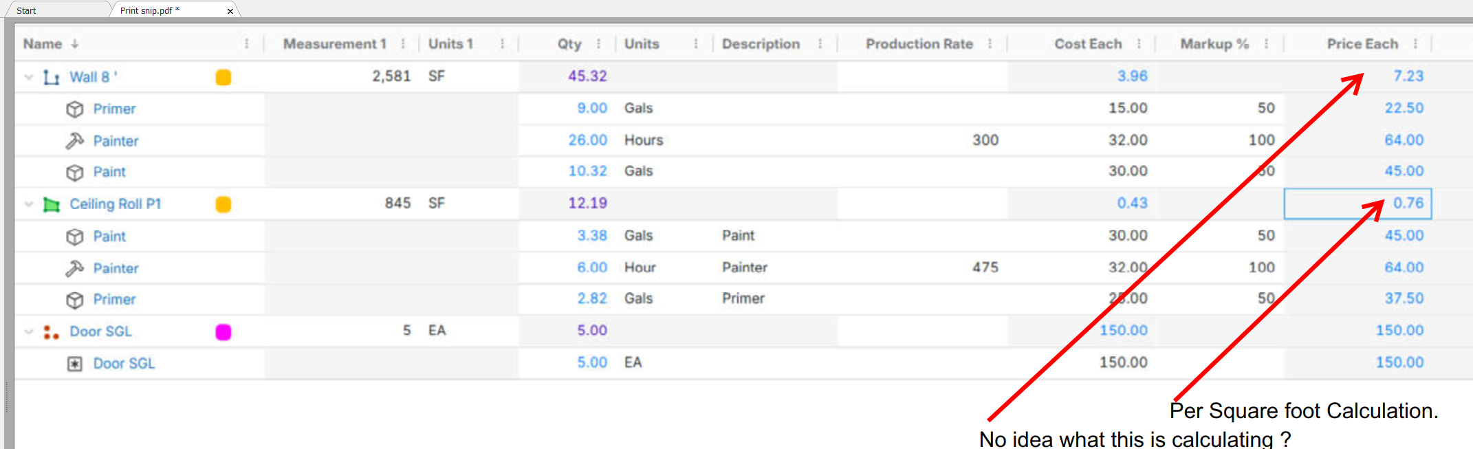 If you look below some of them make sense to us but others don't. The area tools seem to be calculating a per square foot price (which is what we want) but the linear tools (when inputing wall area) don't average out to a per sq foot price. Make it make sense and can this be altered, edited to work the same across the board (per sf average)?