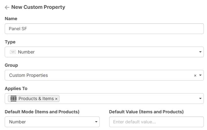 Now if you go to your products properties you should find a "Panel SF" property and add the number required (if you prefer a formula to add the width x length, you can configure the default mode as Formula instead of number in the new property panel).