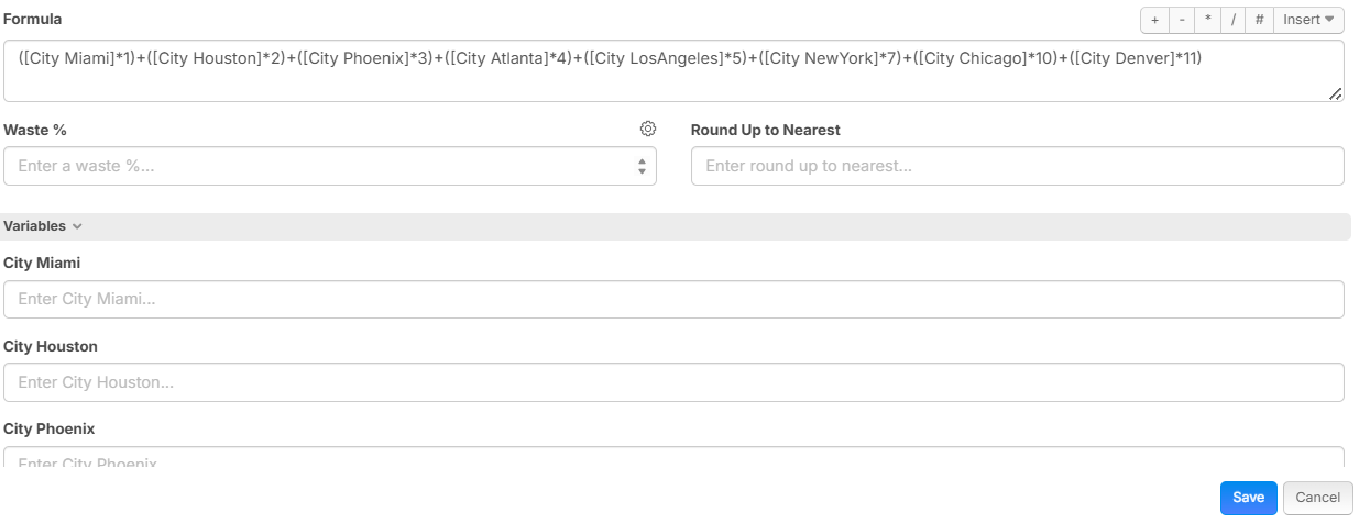 ([City Miami]*1)+([City Houston]*2)+([City Phoenix]*3)+([City Atlanta]*4)+([City LosAngeles]*5)+([City NewYork]*7)+([City Chicago]*10)+([City Denver]*11)
