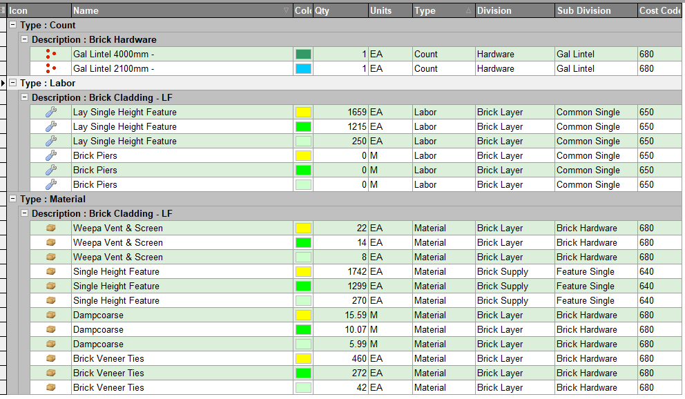 I'd suggest adding "Cost Centres" to your individual items. I use a combination of three. Cost Centre Number (640 Brick Cladding, 650 Brick Laying, 680 Brick Hardware), Division and a sub Division. Then when you build your assemblies, these items then can be sorted to your hearts content - in your reports in those relevant areas. This image is of PS but from what I have seen ZZ allows the same. (I'm in the middle of moving across)