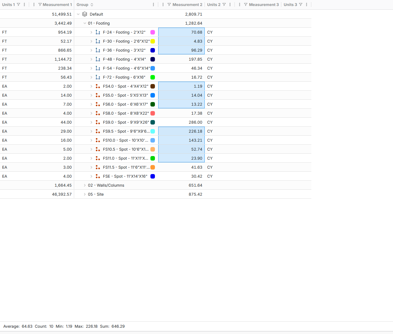 Also if you notice under each of my subgroups the totals are added up there. On my footing line in the measurement 2 column you see 1282.64. That number is the total of all takeoff lines in that group. On the Walls/Columns row the 651.64 is the total of all the individual takeoff lines in that group as well. I just had it collapsed in that picture so you can't see my individual takeoffs.