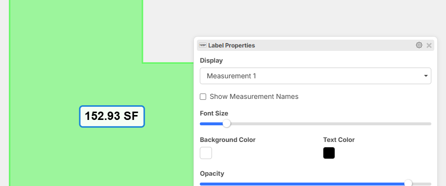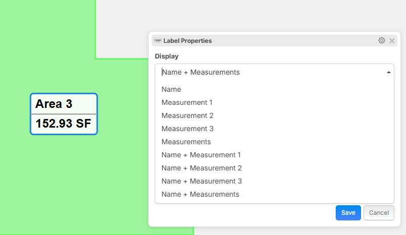 We have some easy options in the dropdown to choose what you want to display in the label, and you can set the default using the gear in the upper right (similar to creating presets for takeoffs).