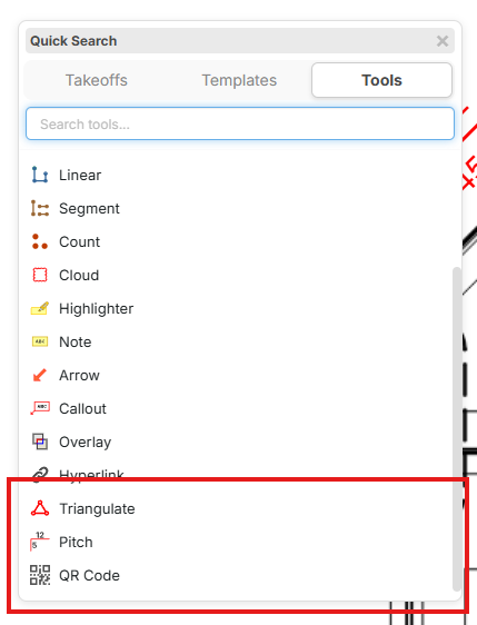 Press the / hotkey to see the quick search popup (in the "Tools" tab). Now we have a Triangulate Tool, Pitch Tool, and QR Code Tool. In the future, we will give an option to place these on the toolbar when we add toolbar customization.