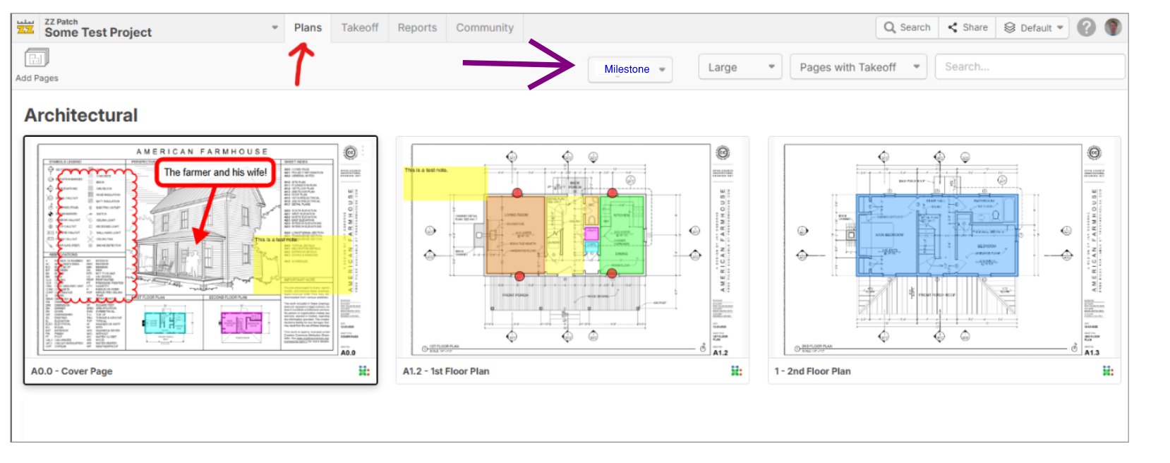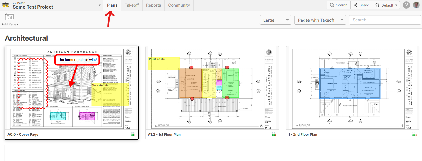 This is just the beginning (bare bones) of this tab where you can see thumbnails and previews. We have some plan versioning features coming in the next major release, so this is a good time to introduce a bit more plan overview tools. I anticipate there will be tools in here for page rotation, re-arranging, filtering, etc. Just kind of a zoomed out view of the plans. We will also separately allow you to swap out the left sidebar on the "Takeoffs" tab for thumbnail view if you choose (or you could just collapse it altogether). Lots more coming.