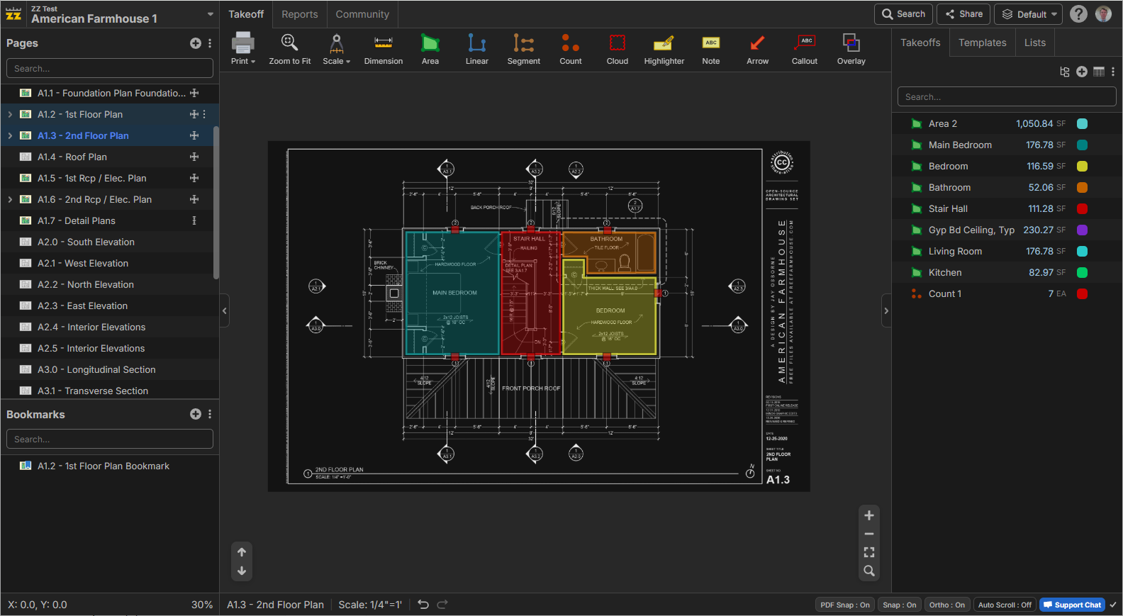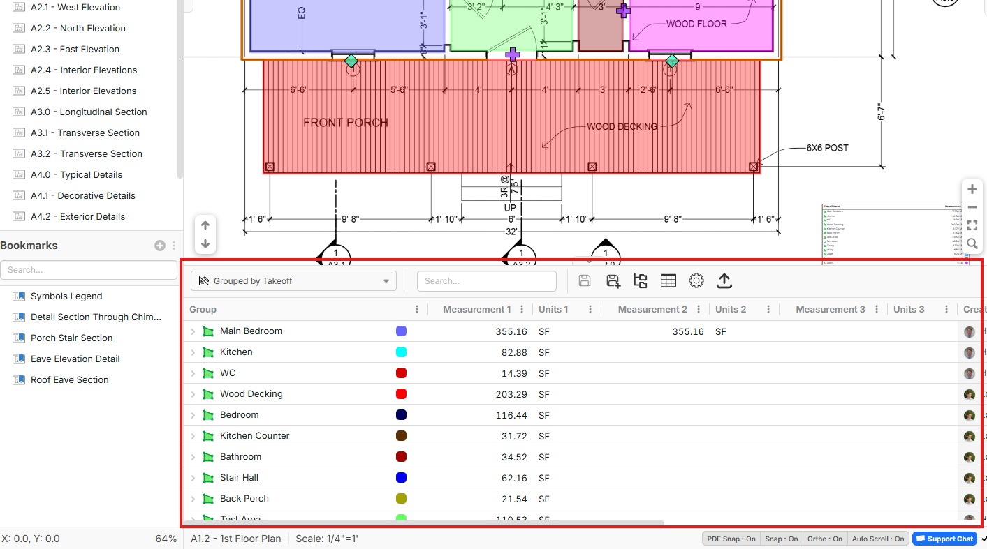 You can now more easily takeoff rooms with box mode. Drawing overlapping boxes auto merges them into the same area. In this mode, hold CTRL while drawing a box to cutout or chop from the edge of the box. Press Tab hotkey to toggle between box mode and point to point mode. Box mode can be used for to area or linear takeoffs.