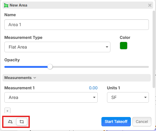 When starting a takeoff for area or linear, you can decide the mode before you start takeoff in the lower left of the popup. You can also customize your templates so that box mode auto activates for specific templates using this same setting in the lower left of the popup.