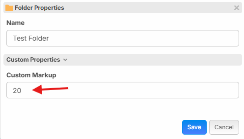 This is showing an item that is in the folder shown above, and it's inheriting the Custom Markup. It shows in green when inheriting, and you can easily override the value. You could create a property at the project level and override it at the folder level, takeoff level, or item level.