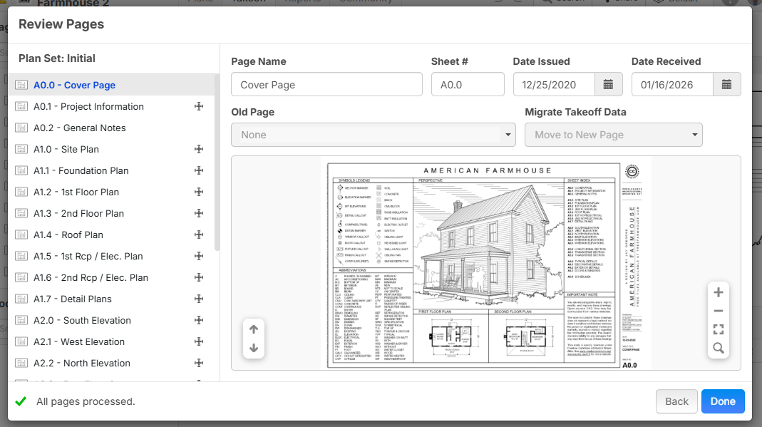 Now when you upload new images, you have the option to attach those images to a Plan Set, and assign a revision #. You will be given the option to migrate old takeoff data to the new pages. This is in early stages, so there will be lots more additions for filtering pages by plan set, etc.