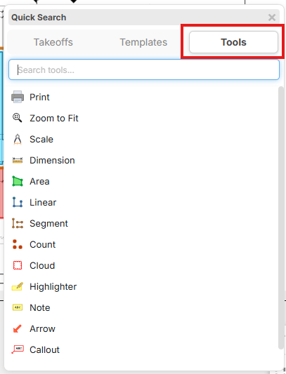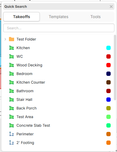 Just hit Spacebar for a quick popup of existing takeoffs that you can continue with. You can also switch to the templates or tools to takeoff from those.