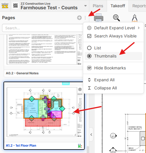 You can also toggle the left sidebar of the "Takeoff" page into Thumbnail view if you want (by clicking the ... menu at the top right of the pages sidebar by the +).