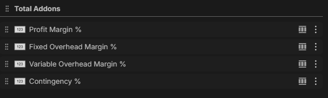 (([Profit Margin %] + [Fixed Overhead Margin %] + [Variable Overhead Margin %]) / 100) / (1 - (([Profit Margin %] + [Fixed Overhead Margin %] + [Variable Overhead Margin %]) / 100)) * 100 + [Contingency %]