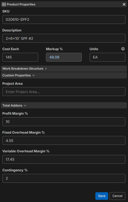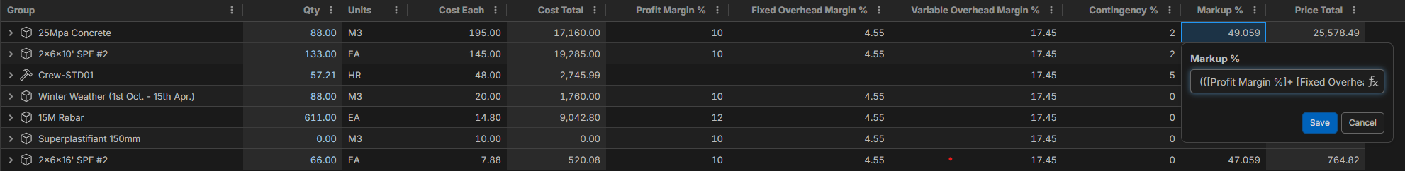 This allows different components (Profit, Fixed OH, Variable OH, etc.) to be adjusted on the fly — either at the item level or directly within reports.